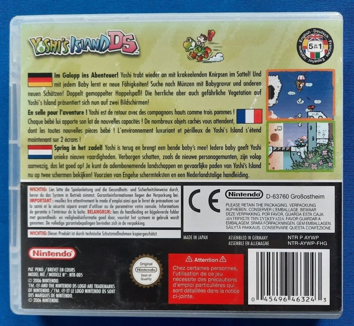 Baby Mario is weer eens ontvoerd en het is aan Yoshi en zijn vriendjes om hem te redden. In Yoshi's Island DS krijg je hulp van een hele bende baby's: Baby Mario, Baby Peach, Baby Donkey Kong, Baby Wario en zelfs Baby Bowser! Elke baby geeft Yoshi unieke vaardigheden, zoals het beklimmen van ranken of het aantrekken van metalen voorwerpen. Reis door prachtig getekende werelden die zich over beide schermen van je DS uitstrekken in deze onmisbare platform-klassieker.